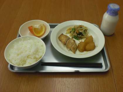今日の給食は、ごはん・魚(さわら)の西京焼き・おひたし・じゃがいもの甘辛煮・くだもの・牛乳です。
