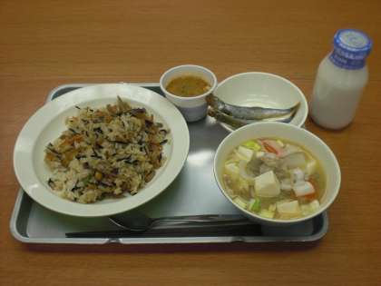 今日の給食は、豆入りひじきごはん・豚汁・焼きししゃも(2尾)・黒蜜寒天・牛乳です。
