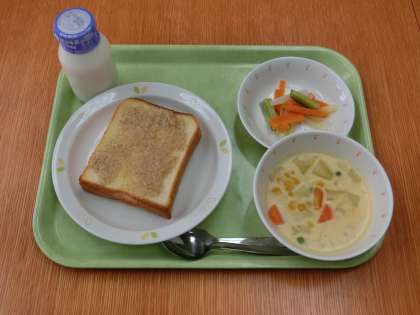 「セサミトースト、クリームスープ、ピクルス、牛乳」です。