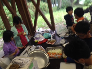 その後2時半からお楽しみのカレー飯ごう炊さんをしました。調理実習もしていない子供達が包丁と火を使うのですからヒヤヒヤものですが、子供達は嬉しそうに怖いもの知らずで挑み、美味しいカレーが出来ました。