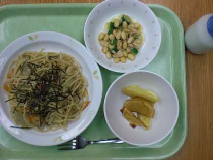 「和風スパゲッティー、フライドポテト、ビーンズサラダ、牛乳」です。