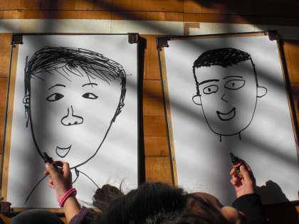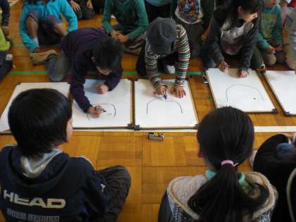 3月11日(木)の朝、たてわり班の集会が行われました。各班ごとに1〜5年生のみんなで、1年生は目とまゆ毛、2年生は鼻と口、仲よし学級は耳、3年生は髪の毛、4年生は顔の輪郭、5年生は全体の仕上げというように、卒業していく6年生の似顔絵をリレーしながら描きました。6年生の特徴をとらえようとしっかりと顔を見て描いていました。できあがった似顔絵をみた6年生は、ニッコリとした笑顔でうれしそうな表情を見せていました。