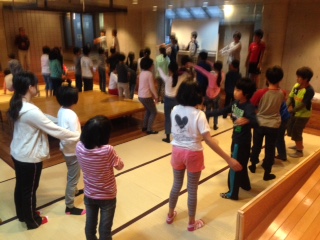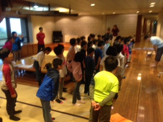 2日目の朝。外は雨。天気予報でも1日雨。6時半からの朝会は大広間で行いました。楽しい体操をしました。