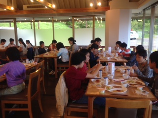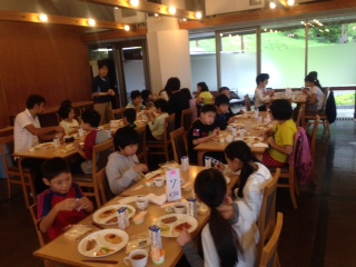 なかのビレジでの最後の朝食風景です。パン、ハッシュポテト、ウインナー、サラダ、牛乳などでした。