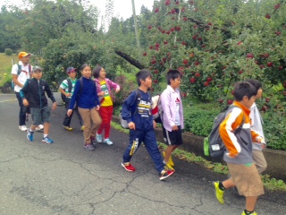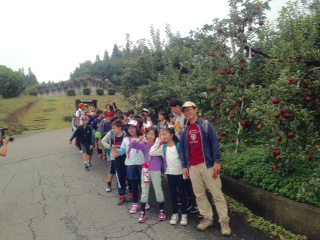 村巡りはまず、美味しそうに真っ赤に実ったリンゴの木々、ピンク色に優しく揺れるコスモス、ブルーベリー畑黄金色に頭を落とし、穫り入れを待つ稲に囲まれてのスタートでした。東京より一足先に実りの秋を体一杯に感じました。