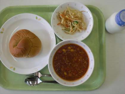 きょうはオリンピック給食の日で、アメリカ合衆国のチリコンカーンです。チリコンカーンは19世紀半ばにメキシコから独立しアメリカ合衆国に合併されたテキサス州南部で発祥したといわれており、テキサス州はこれを「州の料理」に指定しています。一般の食堂でも提供されている庶民的な料理です。ひき肉と玉ねぎを炒め、そこにトマト、チリパウダー、豆などを加えて煮込んだものが最もよく知られています。仕上げにとうもろこしの粉やオートミールでとろみをつけることが多いようです。