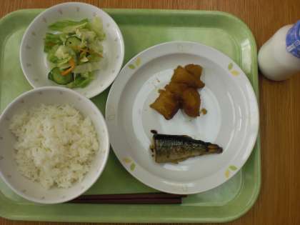 「ごはん、魚の塩焼き、野菜の甘酢かけ、じゃがいもの甘辛煮、牛乳」です。