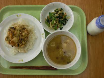 かきあげは、魚介類や野菜を細かく切ったものを小麦粉を使った衣をつけて油で揚げた日本料理です。えび、いかの他に大豆も入っています。給食室でていねいに手作りしました。おいしく揚がったかきあげをごはんに乗せて天つゆをかけて食べました。