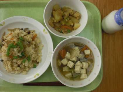 「しめじごはん、じゃがいものそぼろ煮、けんちん汁、牛乳」」です。