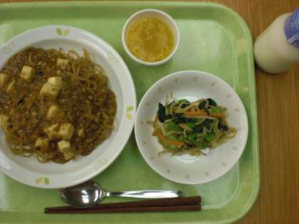 「麻婆豆腐焼きそば、ナムル、みかんゼリー、牛乳」です。