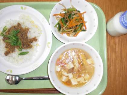 「さばそぼろ丼、野菜のからしじょうゆかけ、吉野汁、牛乳」です。