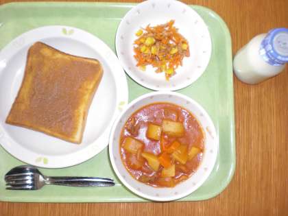 「きな粉バタートースト、トマトシチュー、にんじんサラダ、牛乳」です。