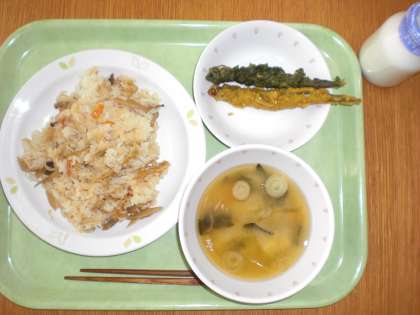 「きのこごはん、ししゃもの二色揚げ、みそ汁、牛乳」です。