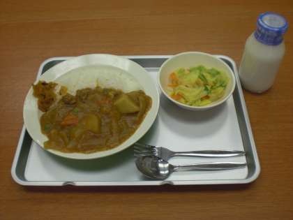 今日の給食は、カレーライス・福神漬け・キャベツサラダ・牛乳です。