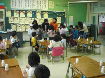 今日から1年生の給食が始まりました。輝く瞳、1年生になった喜びと希望が満面に溢れ、写真にあるように第1回目の給食を嬉しそうに準備をしました。