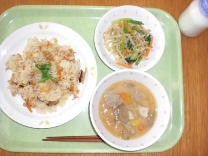 「とりめし、とびうおのつみれ汁、野菜のごまだれかけ、牛乳」です。