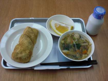 今日の給食は、あげパン(きなこ)、肉団子入り春雨スープ、くだもの(美生かん)、牛乳です。