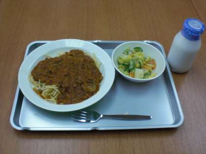 今日は、スパゲッティミートソース、ポテト入りフレンチサラダ、牛乳です。