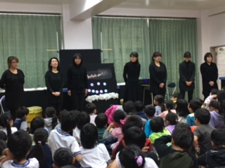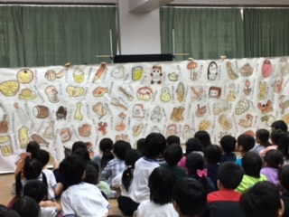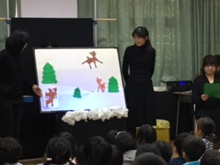 毎年恒例、本校読み聞かせの会の皆様による「大型絵本の読み聞かせ会」が本日の午前中に開催されました。低中高1時間ずつたっぷりとお話会に浸らせていただきました。毎年のことですが、様々に趣向を凝らし、プロ並のお話ワールドを創ってくださいます。今年は、落語話や民話ね楽しさを中心にしながらも、最後の出し物にはブラックライトを巧みに使ったクリスマスの話があり、子供たちの夢や期待も拡がりました。毎日夜遅くまでのご準備、練習、本当にありがとうございました。