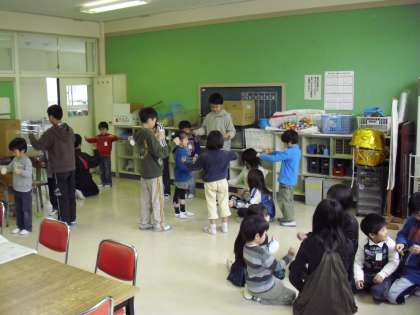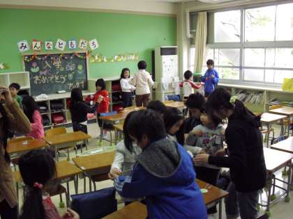 一年生が、迎える会でプレゼントしてもらった「ブンブンごま」を、6年生と一緒に練習しました。みんなとても熱中して練習していました。