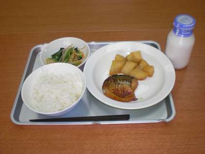 今日の給食は、ごはん・魚(鯖)の照り焼き・じゃがいもの甘辛煮・おひたし・牛乳です。