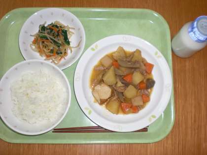 「ごはん、五目うま煮、おひたし、牛乳」です。