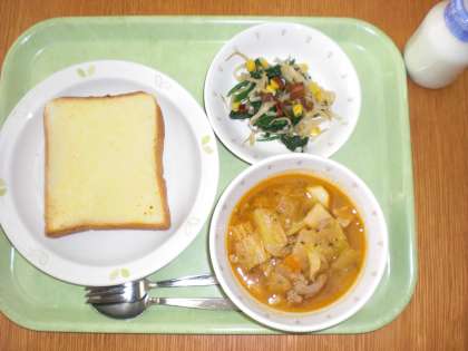 「ガーリックトースト、ボルシチ、ほうれん草サラダ、牛乳」です。