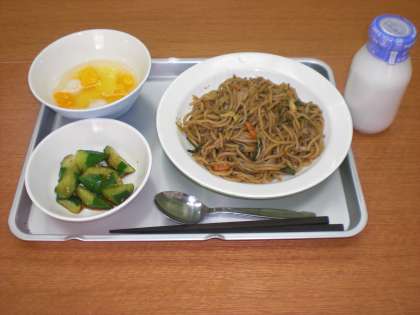 今日の給食は、ソース焼きそば・きゅうりのごま風味・フルーツ白玉・牛乳です。焼きそばは、子どもたちの大好きなメニューの一つです。