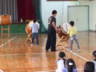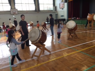 12月12日土曜日に低学年と仲よし学級の子供たちが1時間ずつ和太鼓体験をしました。毎年恒例、松ケ丘太鼓の皆様に教えていただきました。2年生や仲よし学級の子供たちは昨年の経験が生きていて音も構えもリズムも上手でした。実際に東京音頭や炭鉱節のテープに合わせて叩き、みんな嬉しそうでした。