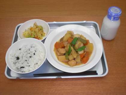今日の給食は、わかめごはん・春野菜のうま煮・ひとしお野菜・牛乳です。