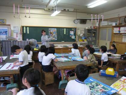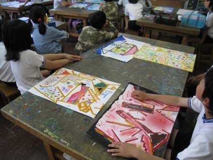 4年生は図工で絵具の利用を中心に『不思議な家』に取り組んでいます。ガムテープを使って家の外枠を作りその中にいろいろな技法で色を塗り部屋を作りました。今日(4月26日)は、その中に住む住人を自由に思い浮かべ(恐竜だったり、ライオンだったり、宇宙人だったり?!)住まわせる作業をしました。集中して取り組む真剣な顔。顔。充実した2時間でした。