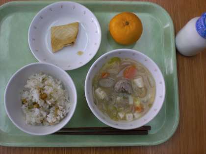 「豆ごはん、いかの照り焼き、いわしのつみれ汁、ぽんかん、牛乳」です。