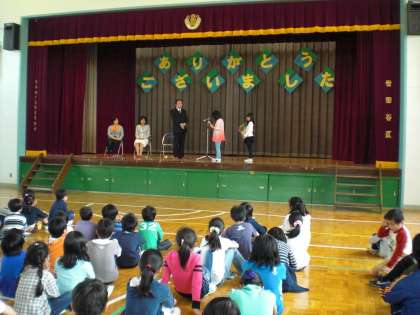 今日は、4月に異動した先生方を迎えて、離任式がありました。子どもたちから、思い出いっぱいのお手紙を渡し、先生方からは、在校生のみなさんにお言葉をいただきました。