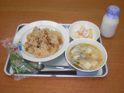 6日(木)の給食は、中華おこわ・わかめスープ・フルーツヨーグルト・柏餅・牛乳です。子どもの日は祝日なので、1日遅れのお祝いをしてこのメニューになりました。