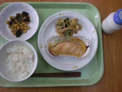 「ごはん、魚のみそマヨネーズ焼き、きのこ入り煮びたし、こんぶ豆、牛乳」です。
