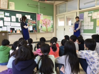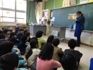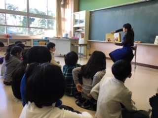 今朝は今年度最後の下学年生への読み聞かせをしていただきました。読み聞かせの会のお母様方が、お揃いの素敵なエプロンを身につけていらっしゃいます。子供たちも教職員もすぐにわかる優しいユニフォームです。