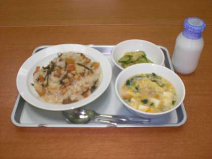 今日の給食は、山菜ピラフ・中華風コーンスープ・野菜の中華味(きゃべつ、きゅうり)・牛乳です。