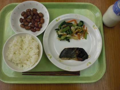 「ごはん、魚の西京焼き、野菜のおかかかけ、煮豆、牛乳」です。