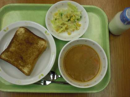 「シナモントースト、コーン入りフレンチサラダ、ビーンズシチュー、牛乳」」です。