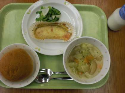 「セサミパン、魚のチーズ焼き、野菜のレモンかけ、ポトフ、牛乳」です。