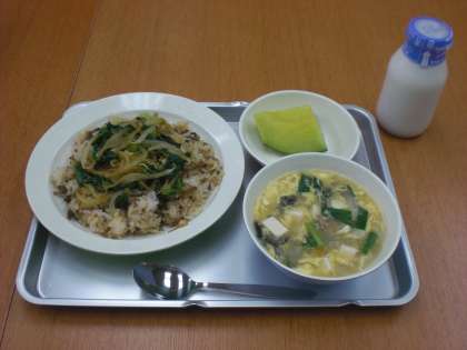 今日の給食は、ビビンバ・にらたまスープ・くだもの(メロン)・牛乳です。