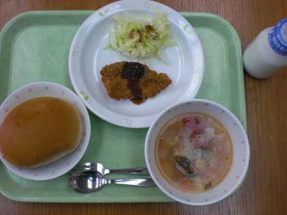 「ミルクパン、魚のフライ、ゆでキャベツ、ミネストローネ、牛乳」です。