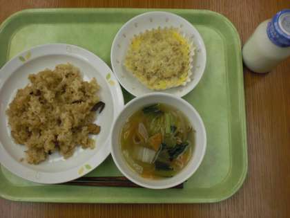 「中華おこわ、切干大根の卵焼き、中華スープ、牛乳」です。