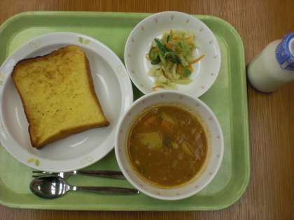 「フレンチトースト、ハンガリアンシチュー、アスパラガスのサラダ、牛乳」です。