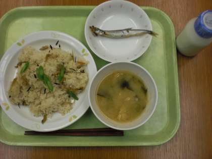 「豆入りひじきごはん、焼きししゃも、みそ汁、牛乳」です。