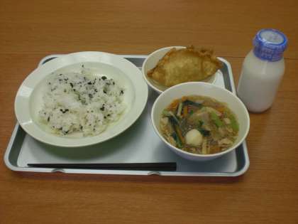 今日の給食は、わかめごはん・ジャンボぎょうざ・春雨スープ・牛乳です。