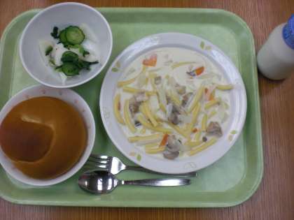 「ミルクパン、マカロニのクリーム煮、野菜のレモンかけ、牛乳」です。