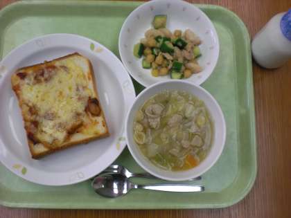 「ピザトースト、ビーンズサラダ、マカロニスープ、牛乳」です。