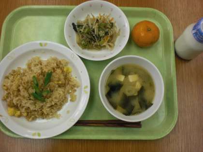 「そぼろごはん、おくらともやしの煮びたし、冷凍みかん、牛乳」です。