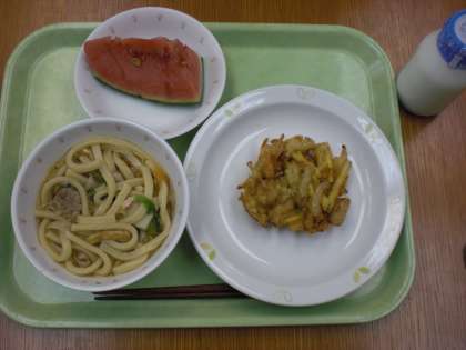 「煮込みうどん、かきあげ、すいか、牛乳」です。